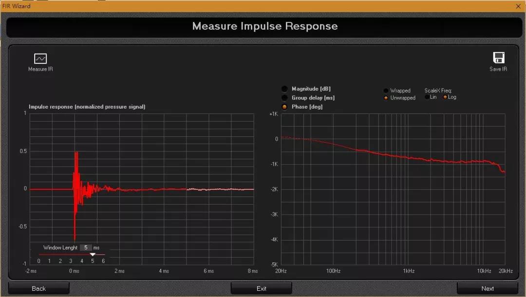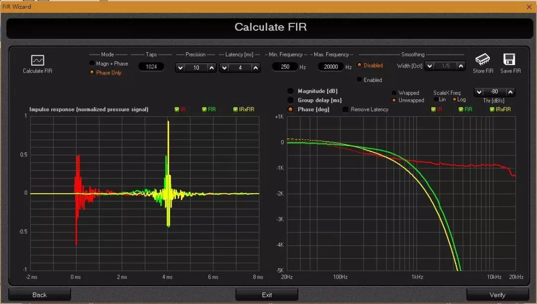 Firstly, the impulse response of the three-frequency speaker is measured. After obtaining the impulse response, the length of the time window is selected, and the setting of the length of the time window will also affect the lower frequency limit of FIR processing. We set it to 5ms, and then set the object of optimization. Because we only do phase optimization, check Phase Only here, select the optimization frequency of 250Hz - 20000Hz, click Calculate FIR, generate FIR convolution file, and save FIR file to the processor.