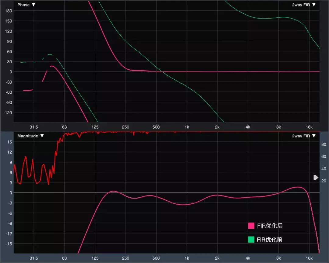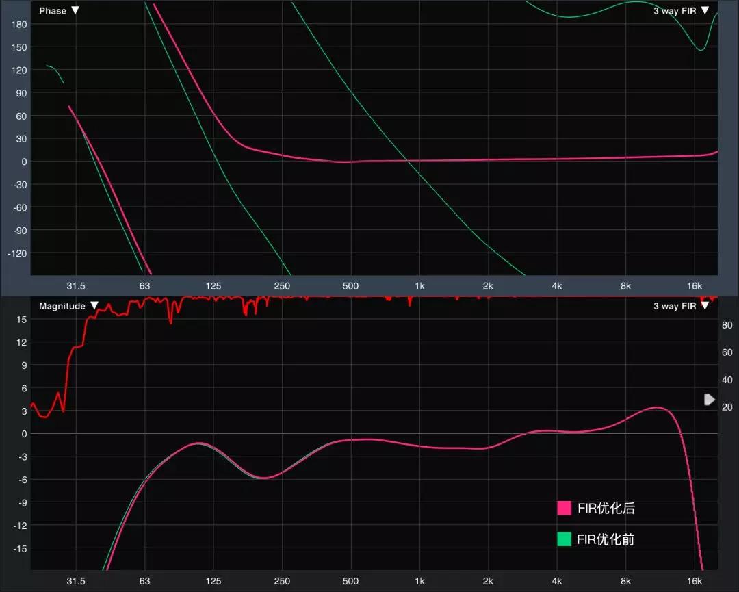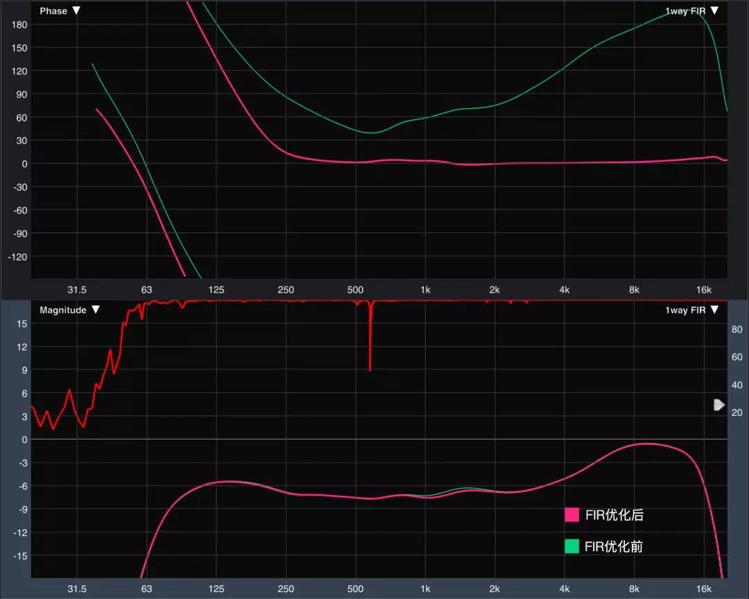 Because of the limitation of time delay and frequency accuracy in FIR processing, frequency division using FIR as speaker unit is not the first choice. Better way is to use IIR filter to set up the frequency division of the speaker, and then use FIR filter to optimize the phase curve of the speaker, so that all the phase curves above the effective working frequency of FIR become straight.
