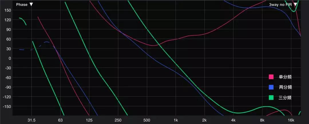 For systems using analog passive frequency division or digital IIR frequency division, the phase offset of the frequency divider roughly determines the phase response curve of the speaker. The following figure shows the amplitude response and phase response of full-frequency speakers with three, two and one frequency dividers.